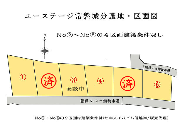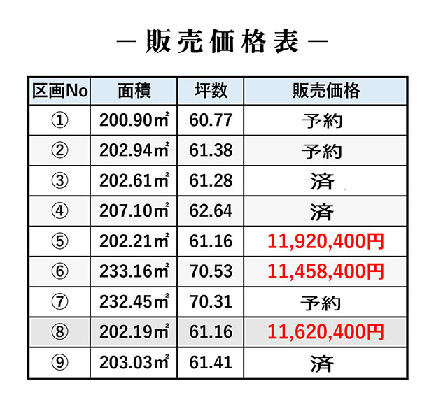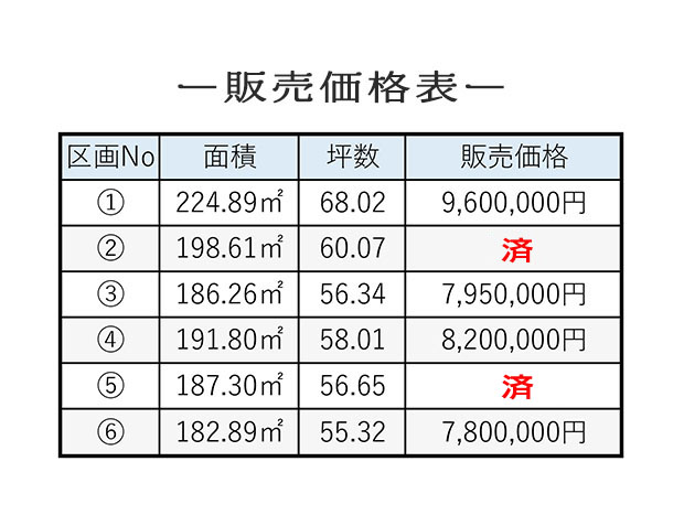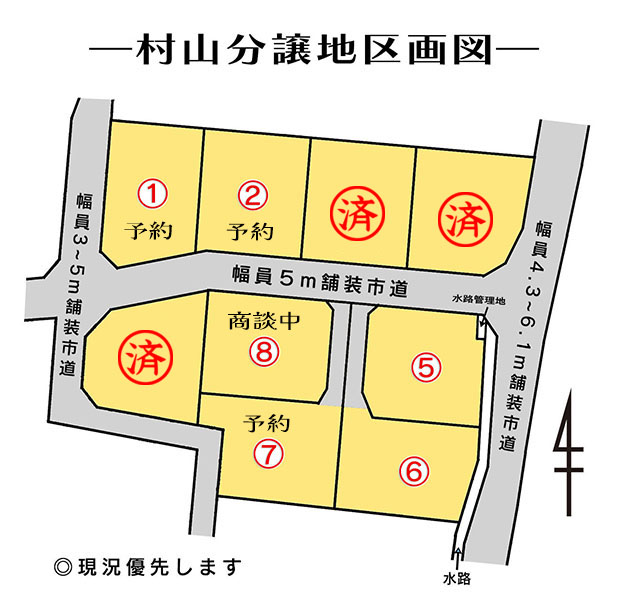 ・所在地:長野市大字村山字市ノ口265-2他・交通:長野電鉄柳原駅約1km・開発総面積:2,411.22㎡・地目:宅地・権利:所有権・都市計画:市街化調整区域(既存宅地)・用途地域:無指定(第二種低層住居専用地域)・建ぺい&容積率:60%&200%・現況:更地・設備:電気、LPガス、上下水道・接道:約5m舗装市道(分譲地内)、幅員4.3m~6.1m舗装市道(分譲地東)、幅員3m~5m舗装市道(分譲地西)・引渡し:即日・通学区:柳原小学校・東北中学校・備考:建築条件なし、造成完了後の実測取引き(面積・価格に若干の増減予定)、浸水想定区域内、分譲地東側市道に①号地が約50cm・⑨号地が約30cm高く接する、⑥・⑦号地の宅地延長部分は2区画共有の舗装敷私道(通行地役権設定有)・工事:令和7年10月竣工・開発許可番号:長野市指令6建指第1-C38号・態様:売主